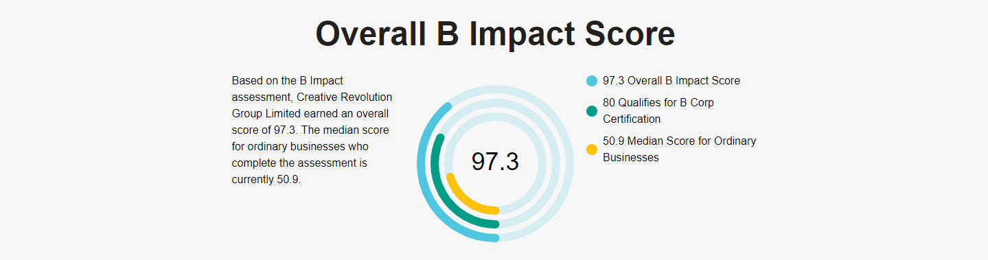Creative Revolution was awarded B Corp certification on Earth Day in 2022, qualifying with a score of 97.3 which we couldn't be happier about!